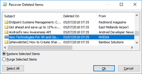Find your email (click on a column header to sort by that column), select the lost email, and click OK to recover it.